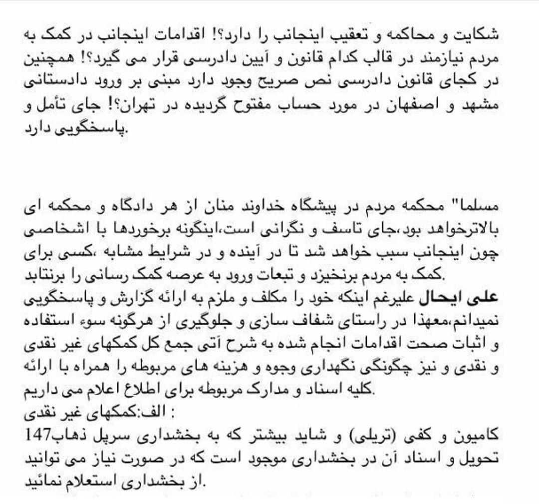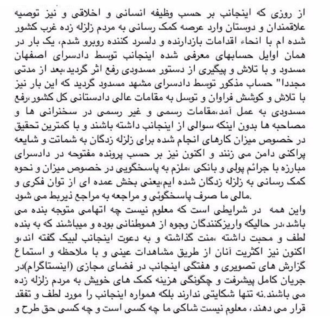 به خاطر وظیفه انسانی و اخلاقی از روز زلزله شروع کردم به کمک رسانی، یک بار دادسرای اصفهان و بعد دادسرای مشهد حسابم را بست. سپس مقامات رسمی و غیر رسمی با کمترین تحقیق شایعه پراکنی کردند و بیشتر توان فکری و مالی من، صرف پاسخگویی به مراجع شد.