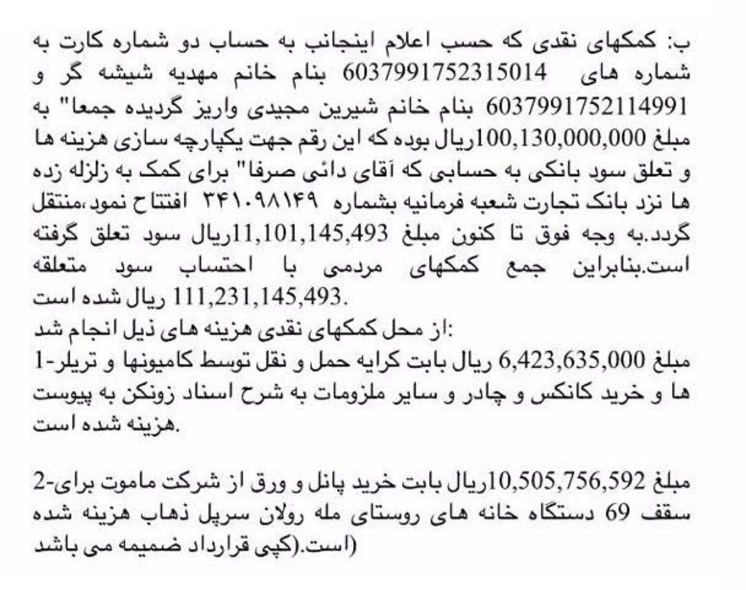 کمکهای نقدی شما عزیزان همراه سود تعلق گرفته مبلغ ۱۱ میلیارد و ۱۲۳ میلیون تومان بوده که محل هزینه ریال به ریال این پول تا به الان، در دو جلد زونکن به همراه تمامی مدارک ارائه شد.