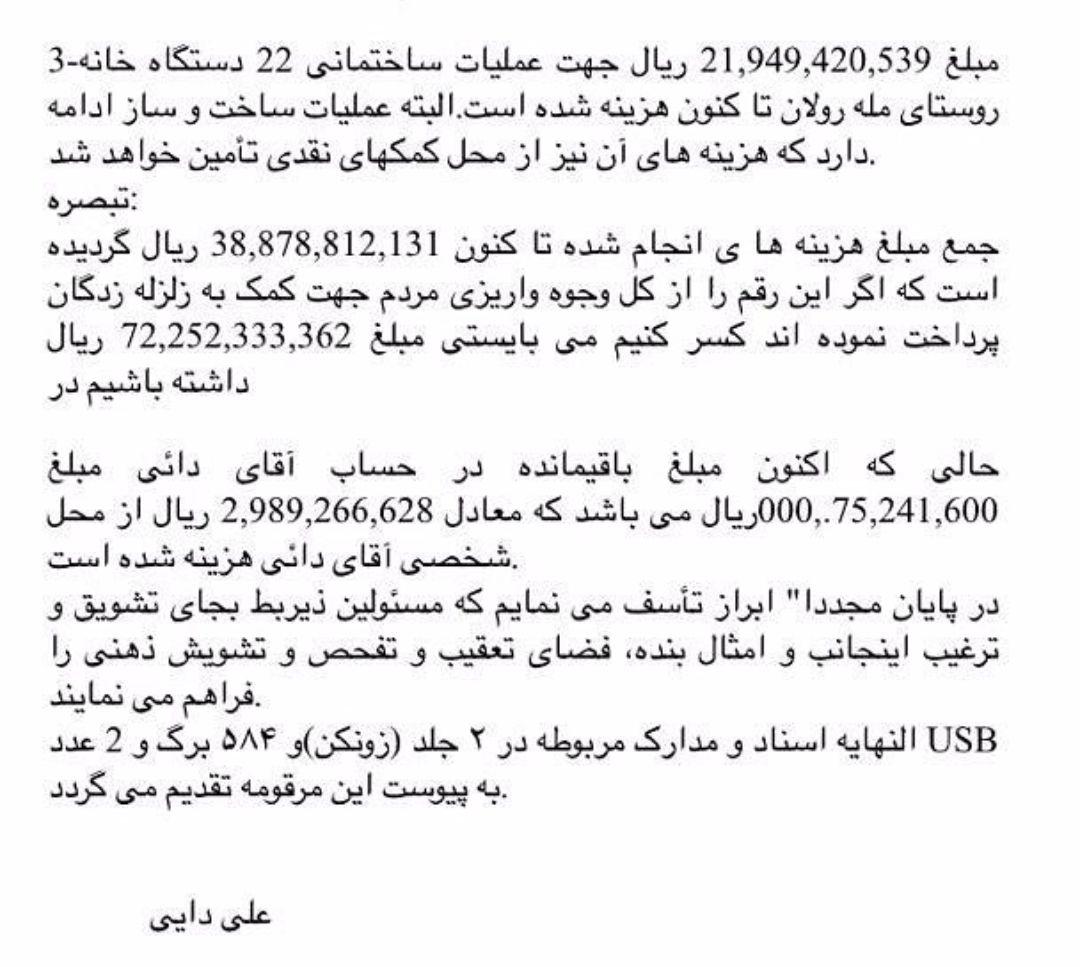 «آخر و عاقبت یازده ماه تلاش شبانه روزی برای ساخت و ساز خانههای مردم زلزله زده کرمانشاه: احضار به آگاهی. مسئولینی که در این مدت به جای اینکه حامی من در ارائه خدمات بهتر به هموطنان نیازمند باشند فقط موجب دلسردی و اختلال در این امر شدند.